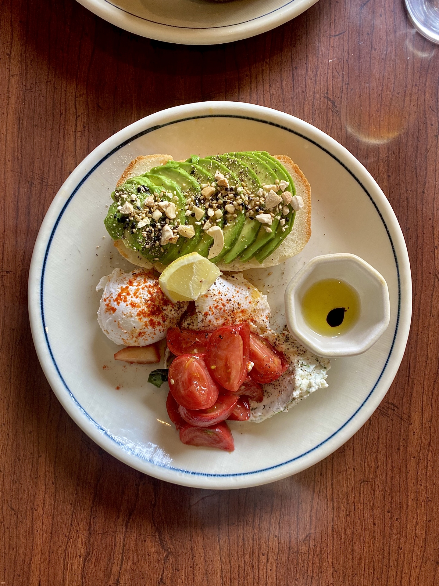 玄米にアボカド、トマト、ゆで卵をのせて、オリーブオイルとレモン汁をかけるだけ。栄養満点で満足感も◎。