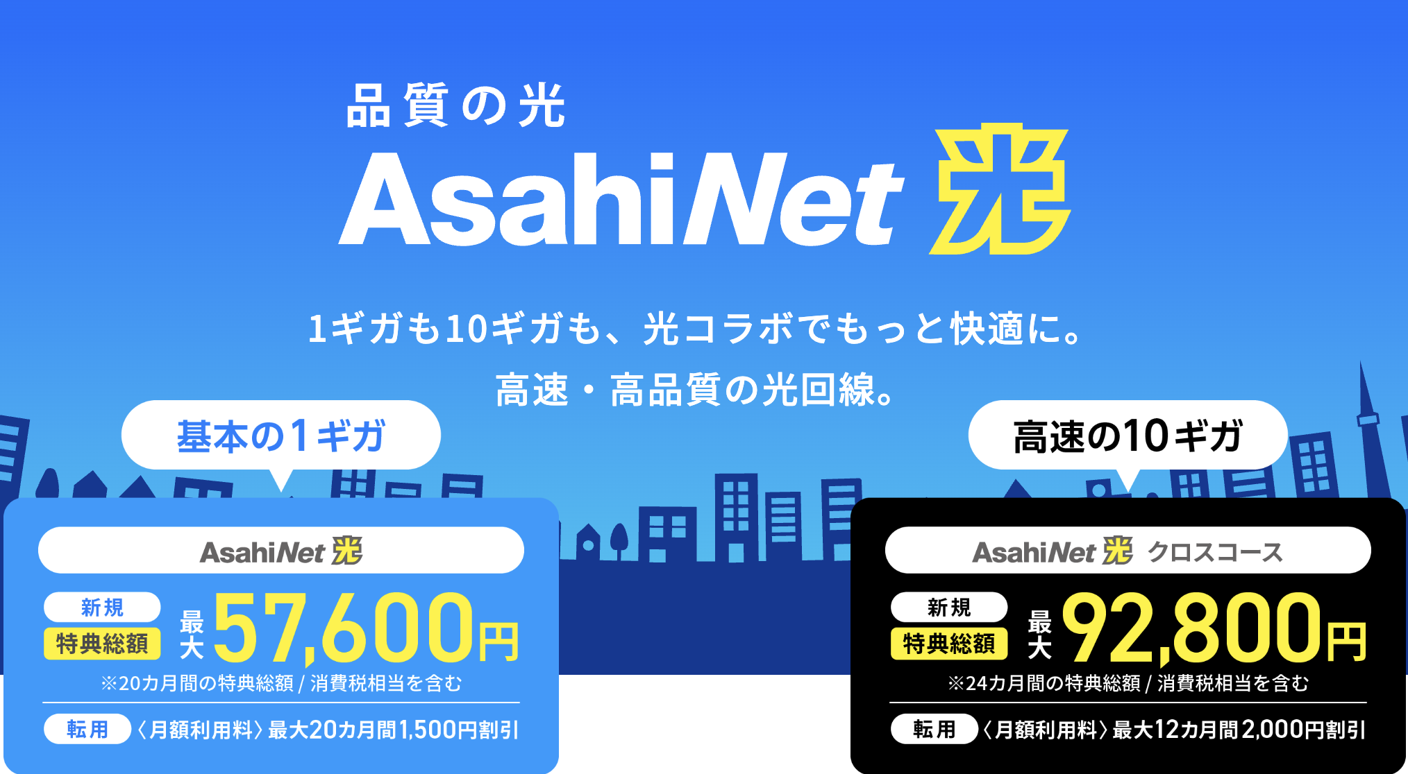 安定した通信速度・豊富なサポート・そして5万円以上のキャッシュバック特典。これらすべてを備えたAsahiNet 光は、コスパの高い光回線を探している方にぴったりの選択肢です。