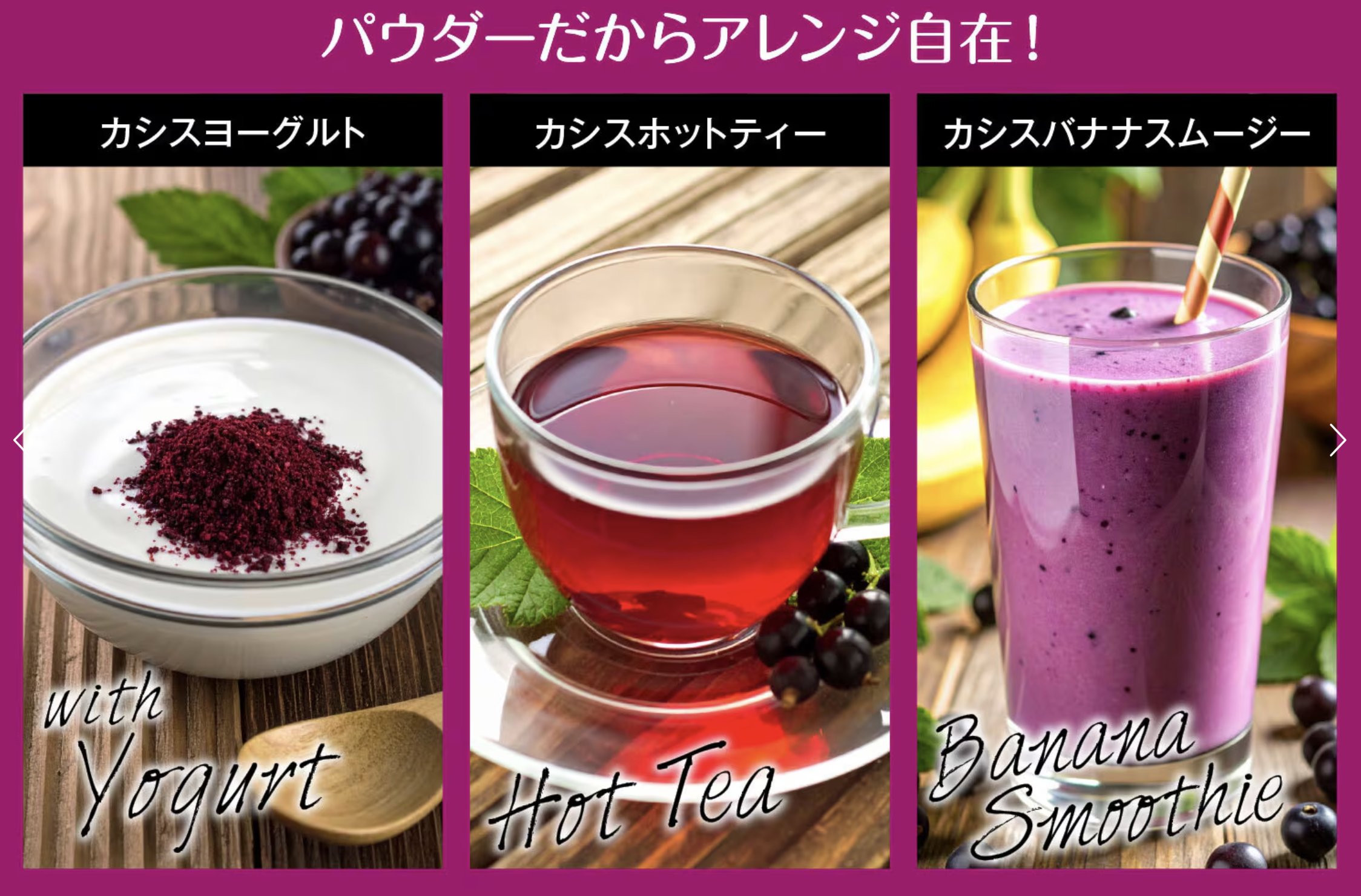 その貴重なカシスを新鮮な状態のまま加工し、香り・味・成分をバランスよく凝縮したのがカシスパウダー。普段の食事や飲み物に混ぜるだけで、自然の力を手軽に取り入れることができます。